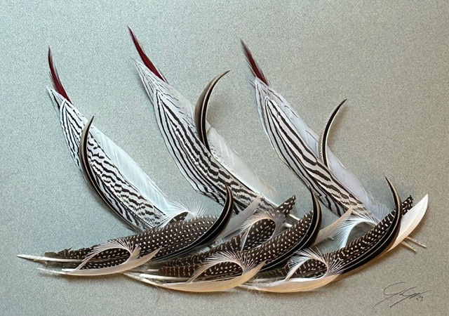Through the subtlety of her marquetry and bas-relief linked to the movement of feathers, she creates and produces, in a cabinet of curiosities spirit, paintings with mosaic, graphic, optical and ethnic effects of diverse inspirations...